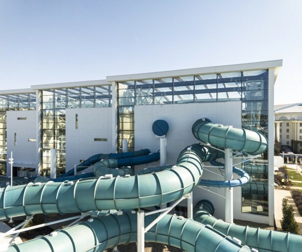 Поскольку аквапарк разделен на открытую и закрытую зоны, наши специалисты получили широкие возможности для экспериментов и сумели сконструировать уникальную трассу. Она начинается в помещении, выходит на улицу через стену, а затем возвращается назад в помещение.