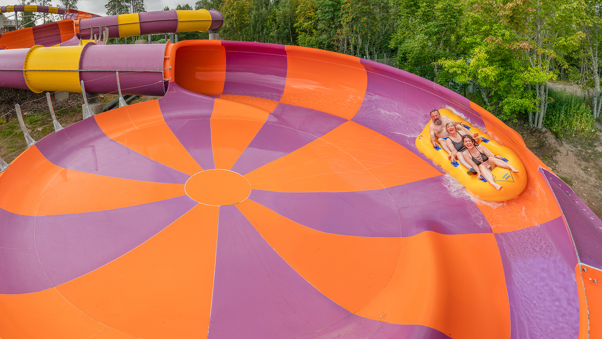 Запатентованная инновационная секция Летающая тарелка — это высокоскоростной участок трассы, где плот проходит вираж по уникальной траектории. Плот рассчитан на 5 человек, и вы сможете почувствовать себя участником гигантского горнолыжного слалома. Более 40 аквапарков по всему миру уже установили Летающая тарелка на своих водных горках.